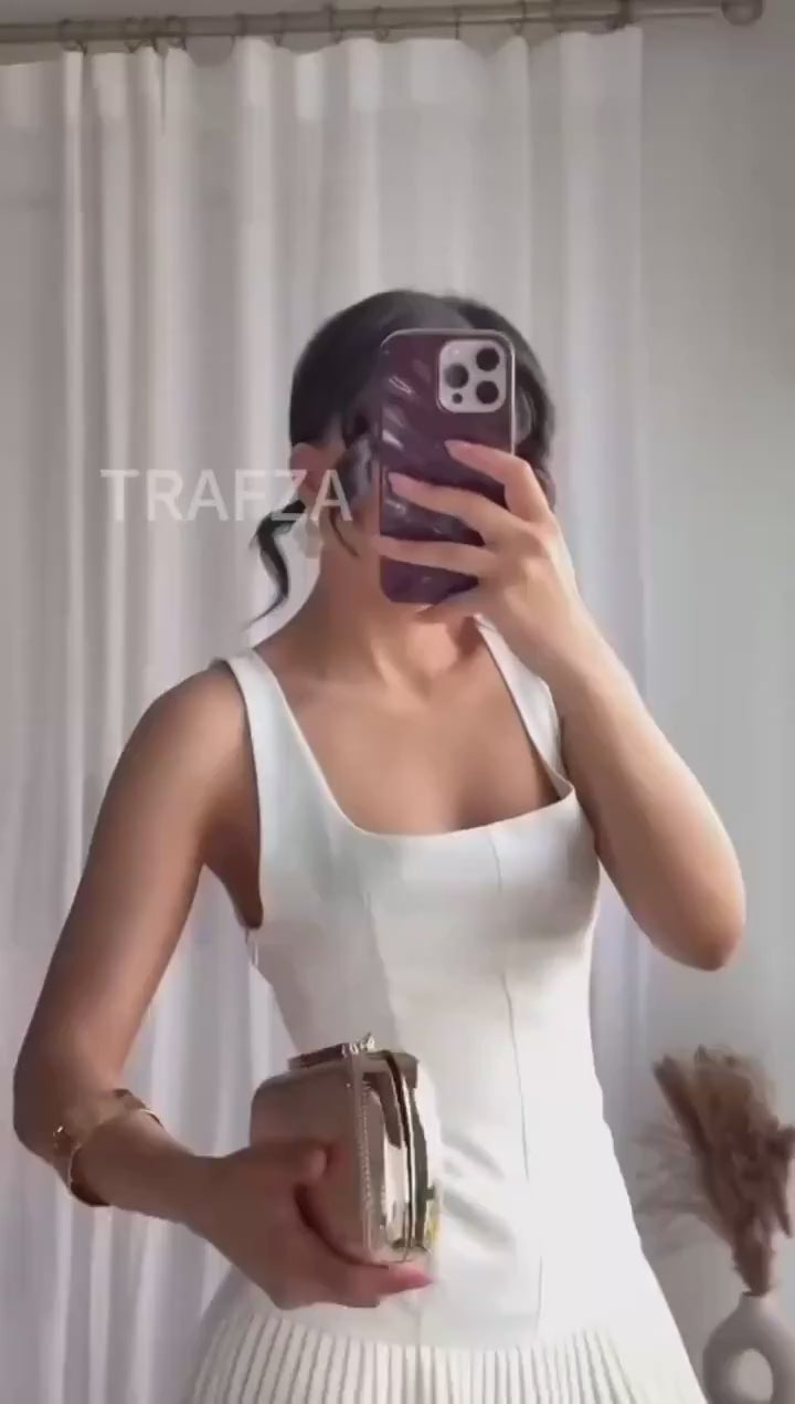 Moteriška mini suknelė – elegantiškas pasirinkimas! Lengvas ir orui laidus poliesteris, kvadratinė iškirptė ir klostuotas sijonas sukuria žaismingą bei išskirtinį įvaizdį, idealiai tinkantį ypatingoms progoms, kelionėms ar miesto pasivaikščiojimams.