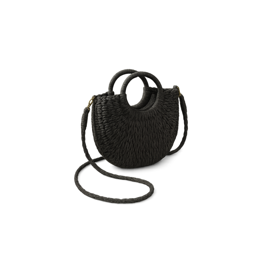 Elegantiška juodos spalvos apvali šiaudinė rankinė – puikus pasirinkimas šiltajam sezonui! Šis kompaktiško dydžio modelis yra stilingas, tačiau pakankamai talpus – telpa visi svarbiausi daiktai. Itin patogi nešioti dėl apvalių rankenų ir ilgos peties juostos, o universali juoda spalva puikiai derės tiek prie ryškaus, tiek prie neutralaus įvaizdžio.