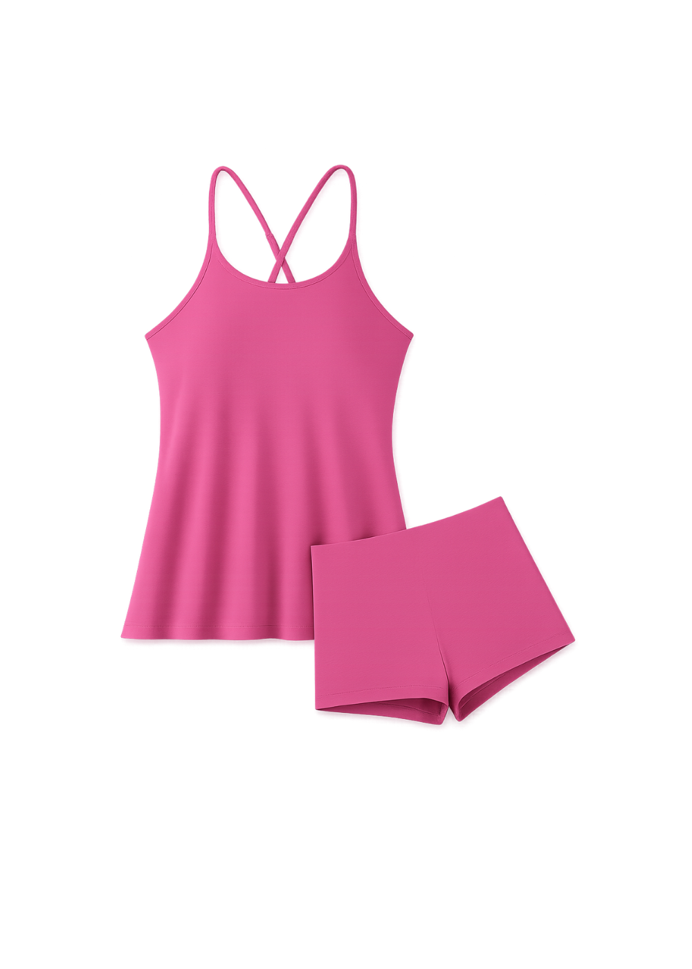 Moteriškas suknelės ir šortų komplektas – praktiškas bei stilingas pasirinkimas vasaros poilsiui! Ryškiai rožinė spalva ir laisvo kirpimo siluetas kuria gaivų ir moterišką įvaizdį, puikiai tinkantį tiek paplūdimyje, tiek aktyviam laisvalaikiui.