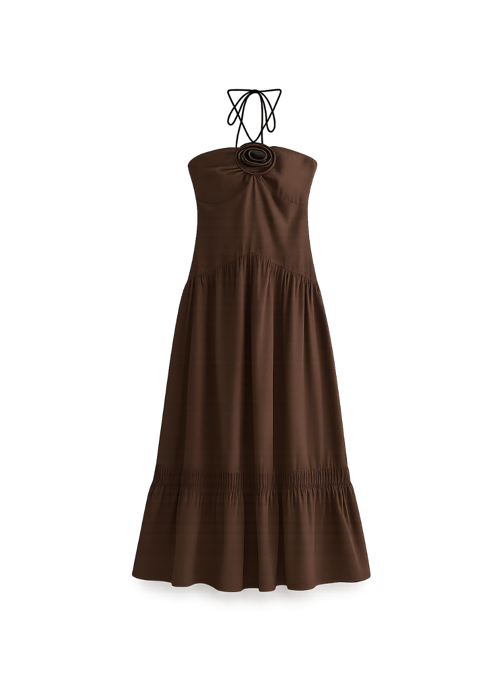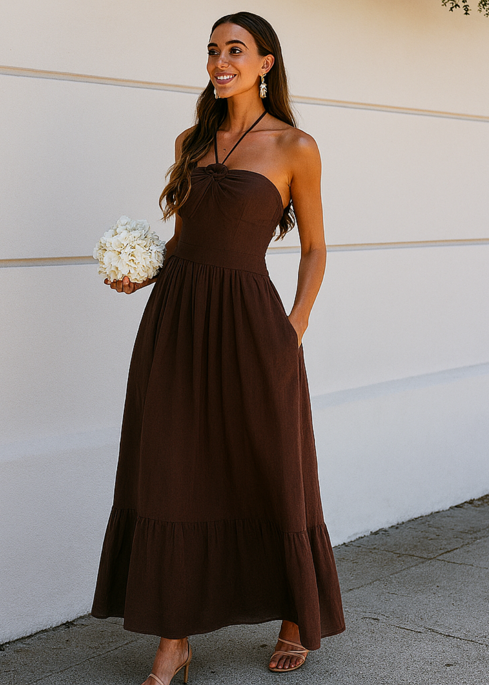 Moteriška ilga vasarinė suknelė – elegancija ir komfortas karštoms dienoms! Ši šokolado atspalvio suknelė su plonomis petnešėlėmis ir rožės akcentu – išskirtinis pasirinkimas tiek laisvalaikiui, tiek vakarui. Lengvas poliesterio audinys nevaržo judesių, o subtilus A formos siluetas puikiai tinka įvairiems figūrų tipams.