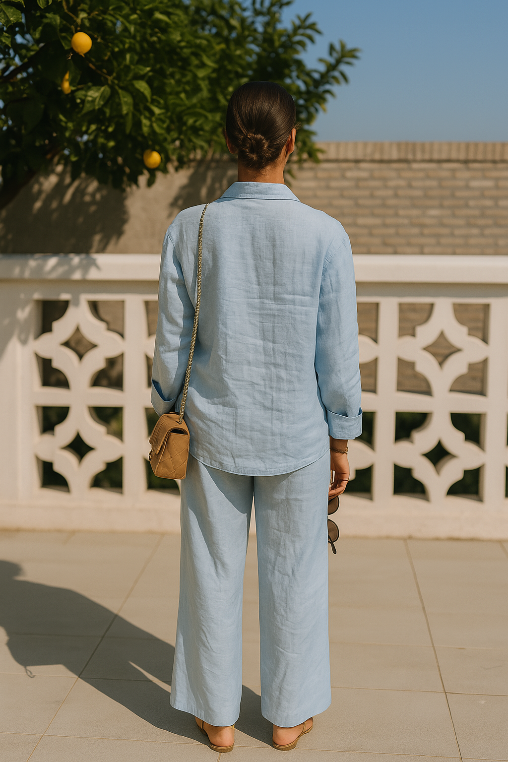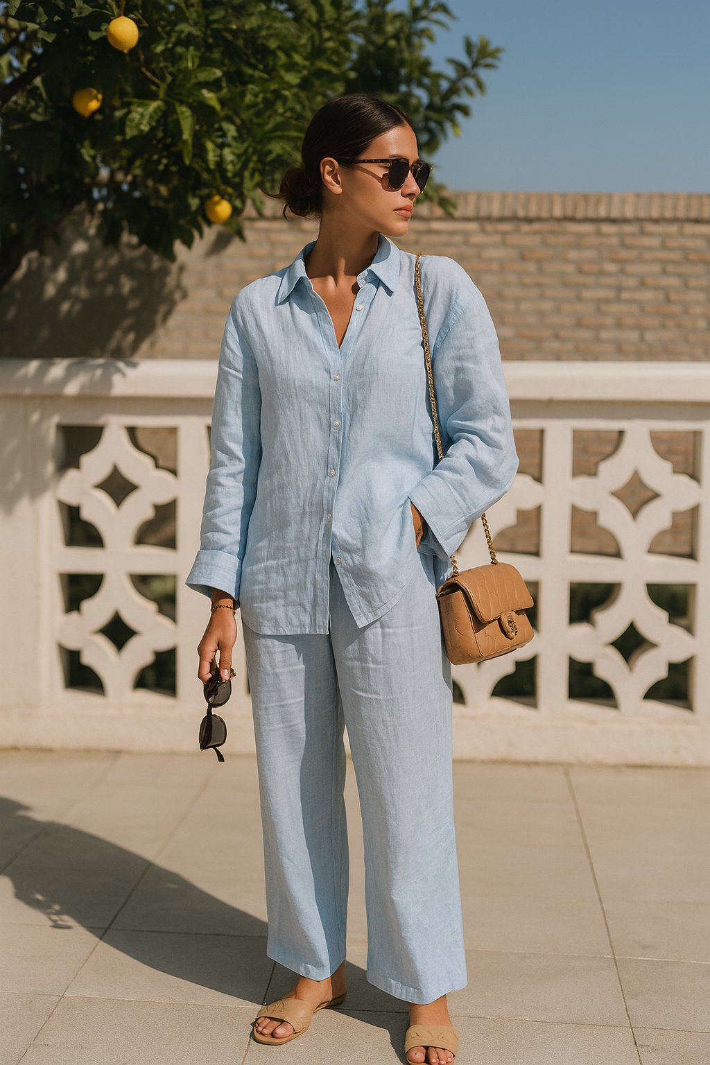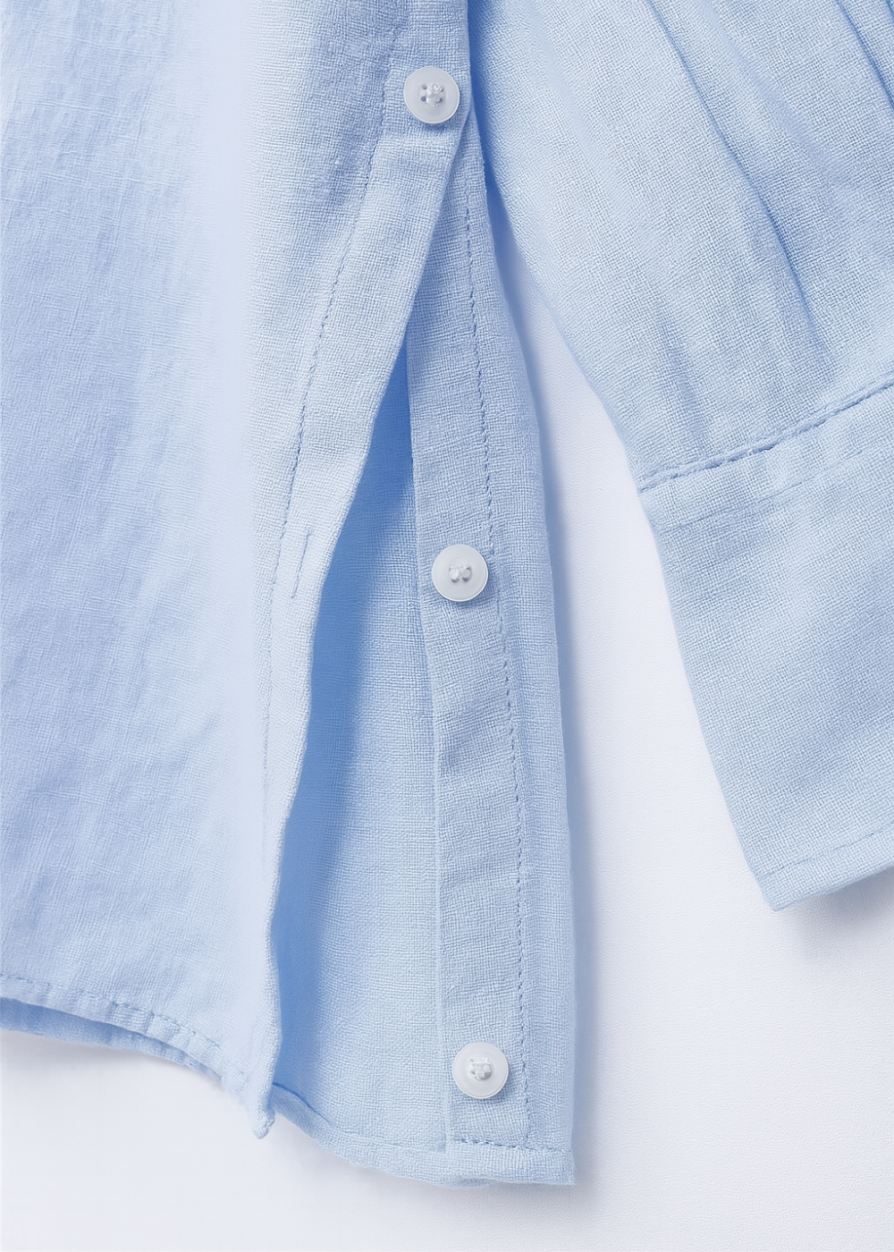 Ilgos rankovės ir užsegimas sagomis – praktiškas sprendimas, tinkantis vėsesnėms vasaros dienoms ar pereinamajam sezonui.