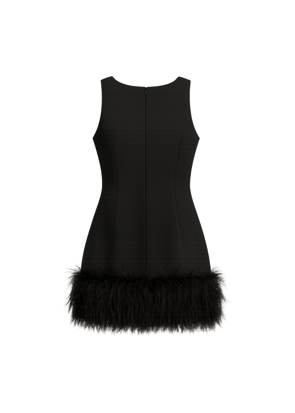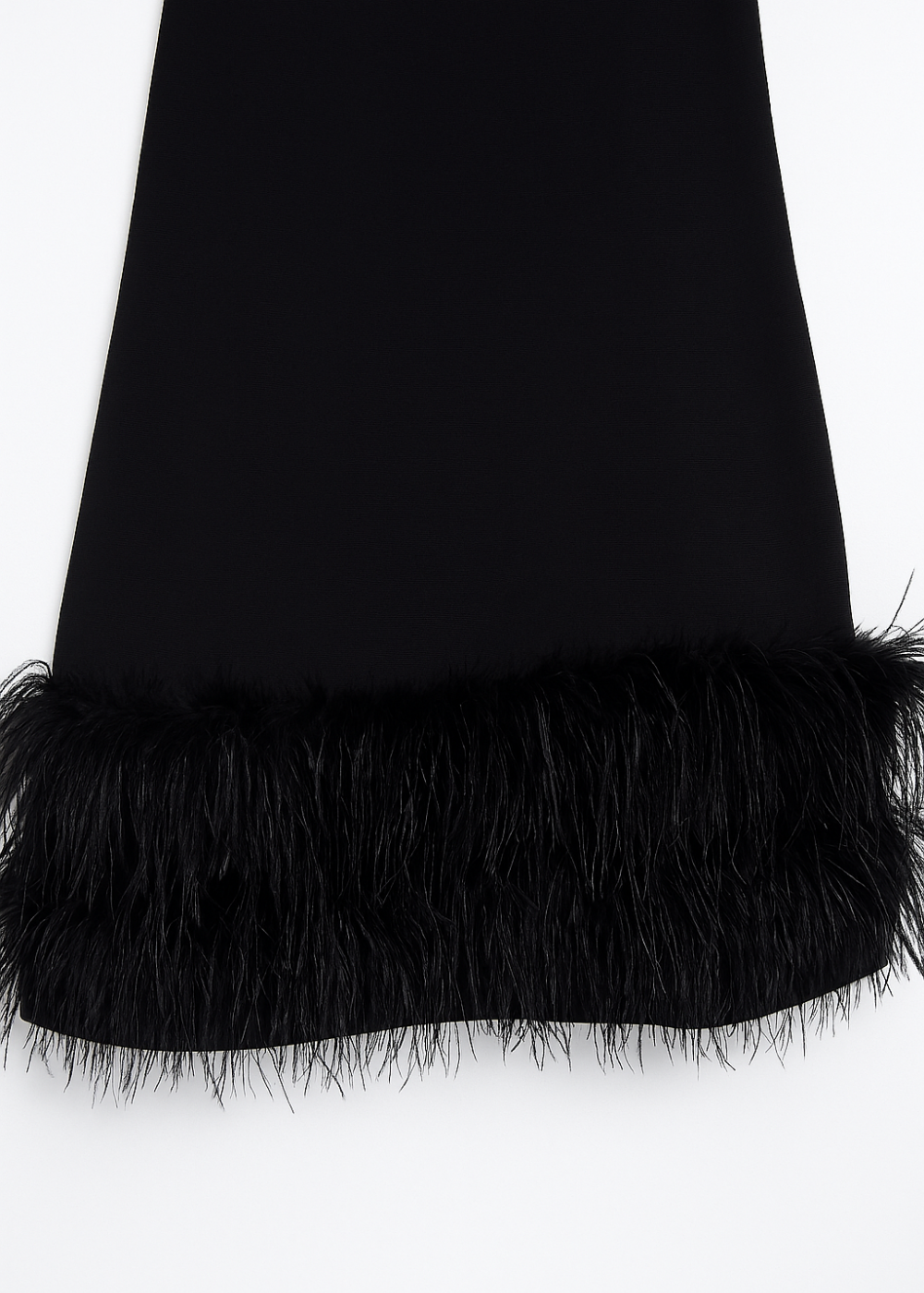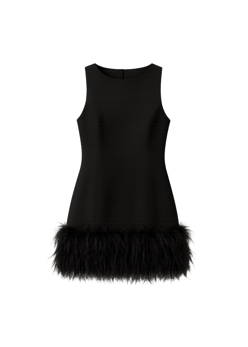 Moteriška juoda mini suknelė su plunksnomis – elegantiškas ir drąsus pasirinkimas vakarui ar ypatingai progai. Klasikinio tiesaus silueto ir minimalistinio dizaino modelis puikiai pabrėžia figūrą, o plunksnomis puoštas apvadas suteikia žaismingumo ir prabangos pojūtį.