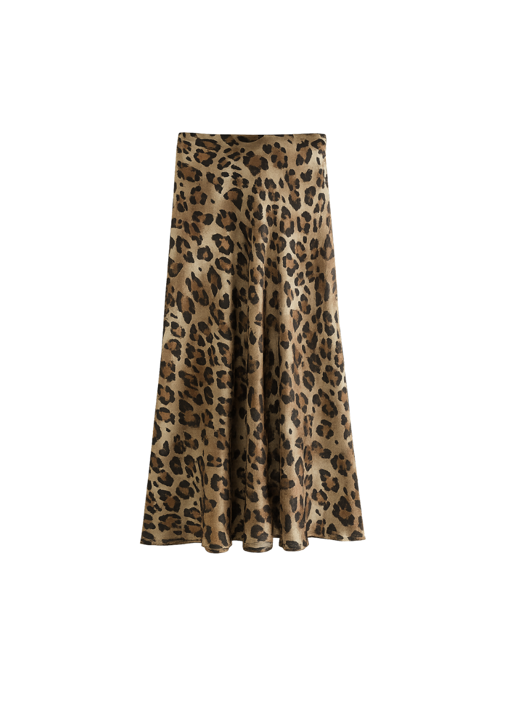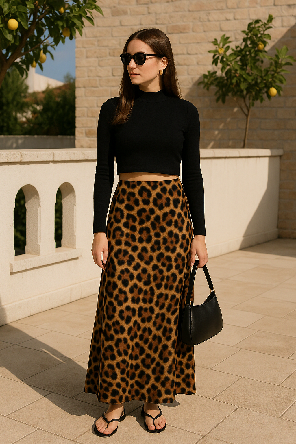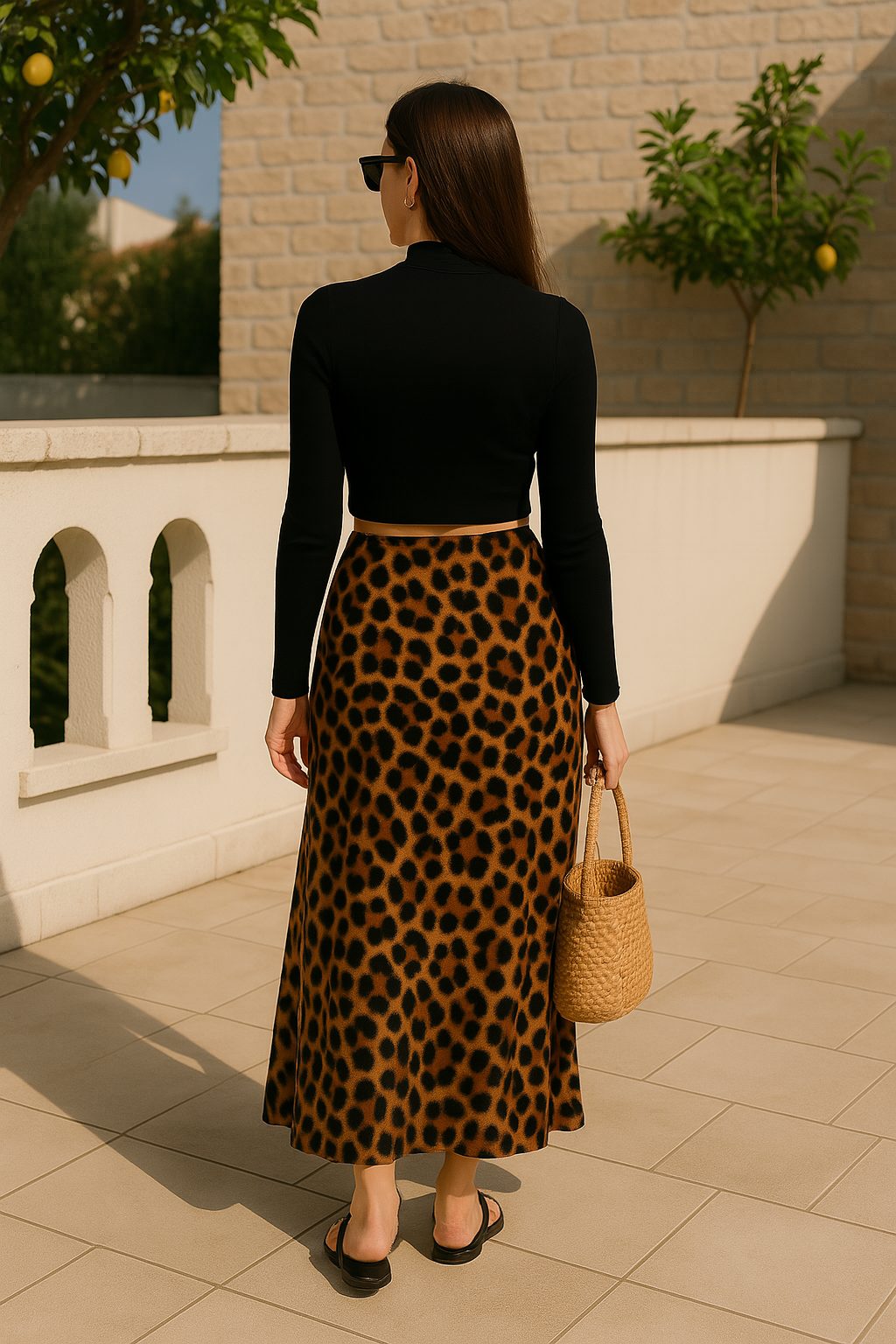 Moteriškas leopardinio rašto satino sijonas – išskirtinis pasirinkimas drąsiai ir stilingai vasaros išvaizdai! Elegantiškas vidutinio ilgio kirpimas, derinamas su glotnia satino tekstūra, suteikia prabangos pojūtį kasdienybėje ar ypatingomis progomis.