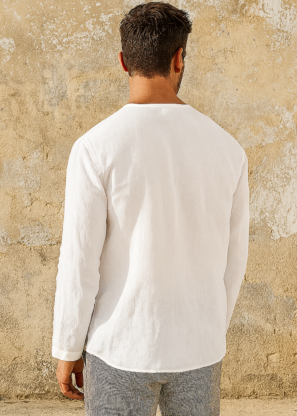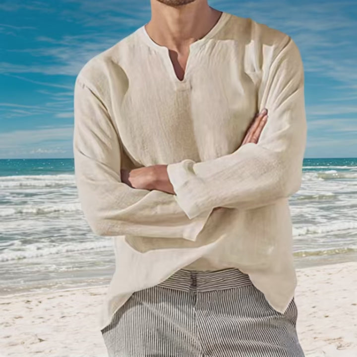 Vyriški marškiniai ilgomis rankovėmis – stilingas ir universalus pasirinkimas vasaros sezonui! V-kaklo iškirptė ir natūralus lino ir medvilnės audinys užtikrina komfortą bei leidžia odai kvėpuoti, todėl tai puikus drabužis tiek kasdieniam dėvėjimui, tiek laisvalaikio išvykoms.