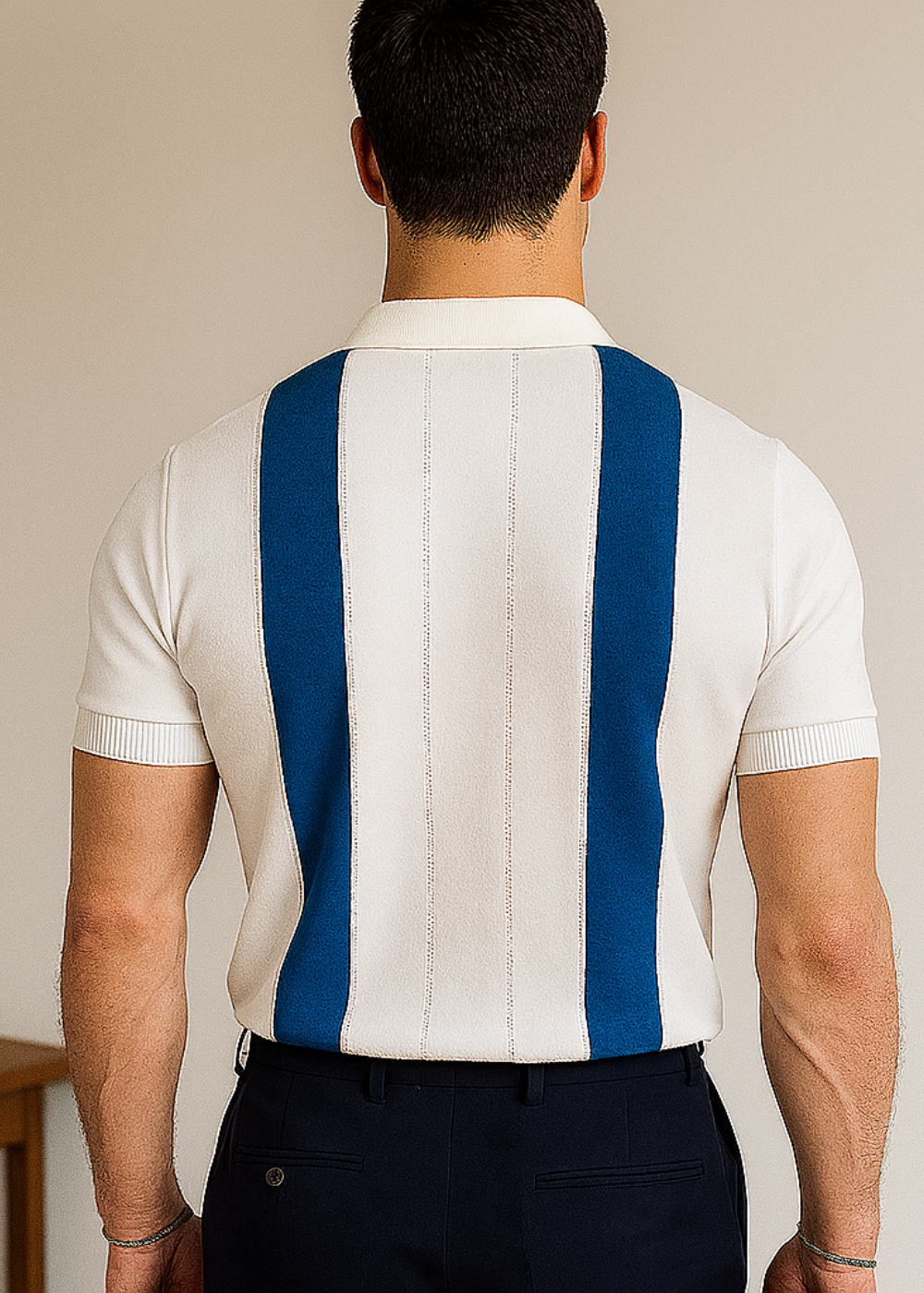 Vyriški megzti polo marškinėliai – modernus ir kvėpuojantis pasirinkimas vasaros stiliaus mėgėjams! Kontrastingos baltos ir mėlynos spalvos sukuria išskirtinį vizualinį efektą, tinkantį tiek miesto gatvėms, tiek laisvalaikio veikloms.